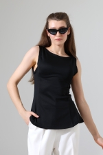 22068  KADIN KAYIK YAKA DOUBLE FACE YUMUŞAK DOKULU YANLARI KUPLU PARÇALI ETEĞİ VOLANLI KOLSUZ TSHIRT